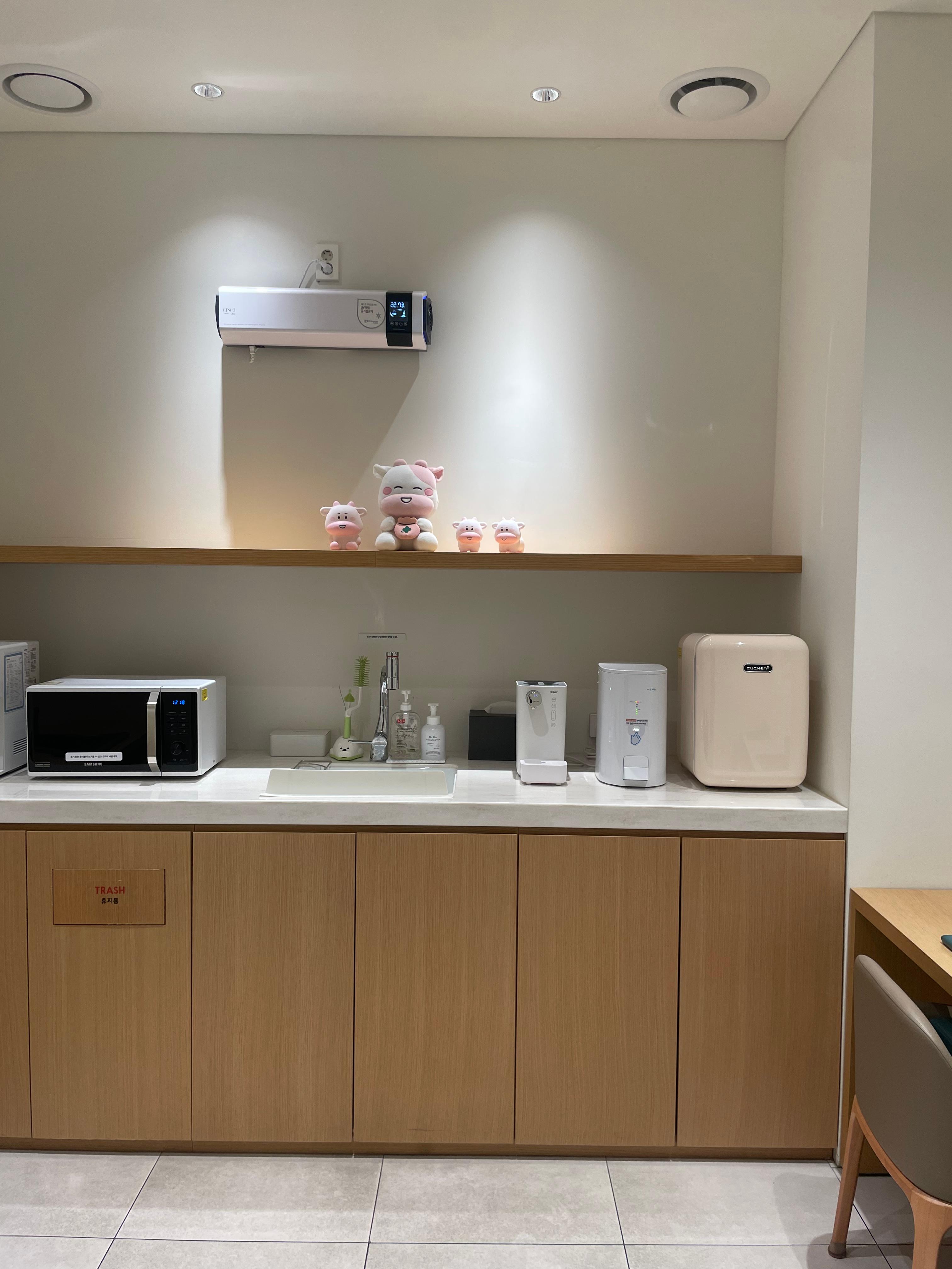 또한, 라운지 옆쪽에는 작은 키친 공간이 마련되어 있어 정수기, 전자레인지, 소독기, 분유포트까지 완비되어 있었습니다. 특히 분유포트는 다른 백화점 유아휴게실에서는 흔히 보기 힘든 시설이라 인상적이었습니다. 분유나 이유식을 준비할 때 매우 유용했고, 아이와 외출 시 큰 도움이 되었습니다.